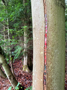 These copper and vitreous enamel works are installed along the hand-cleared pathways of a privately owned and lovingly stewarded area of land. The pieces mark path divergences and special spots, celebrate multiple species sharing growing space, and fill old bark wounds and evolutions. This new work takes into account the way others move within a space while also being deeply personal.